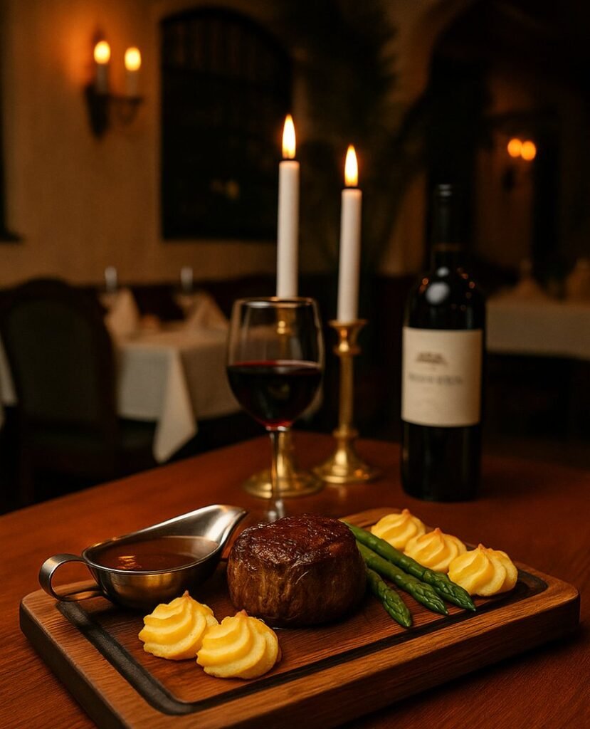 Oxfilé med duchessepotatis, baconlindade sparris och grillad tomat. Serveras med bearnaisesås och pepparsås.