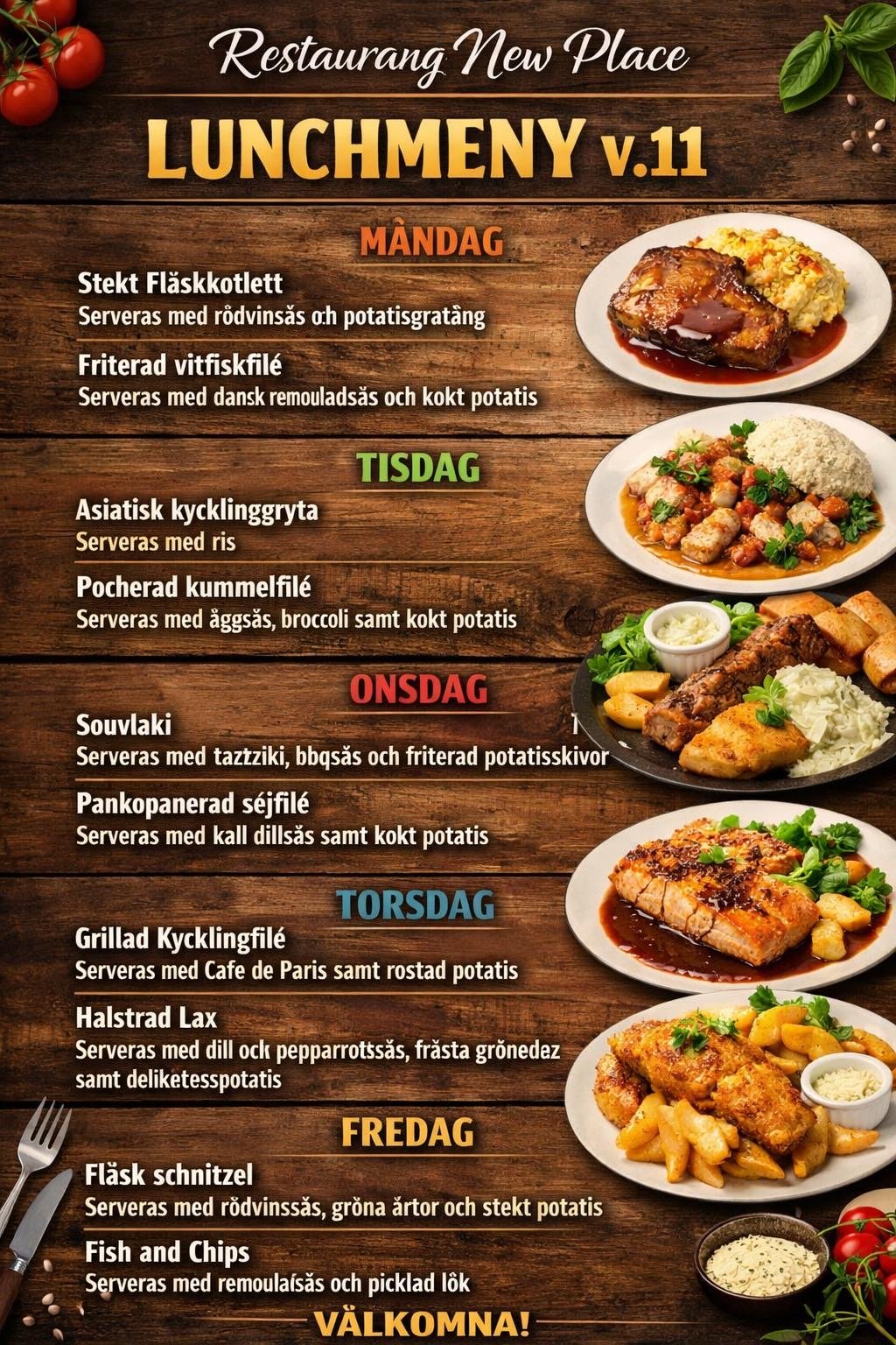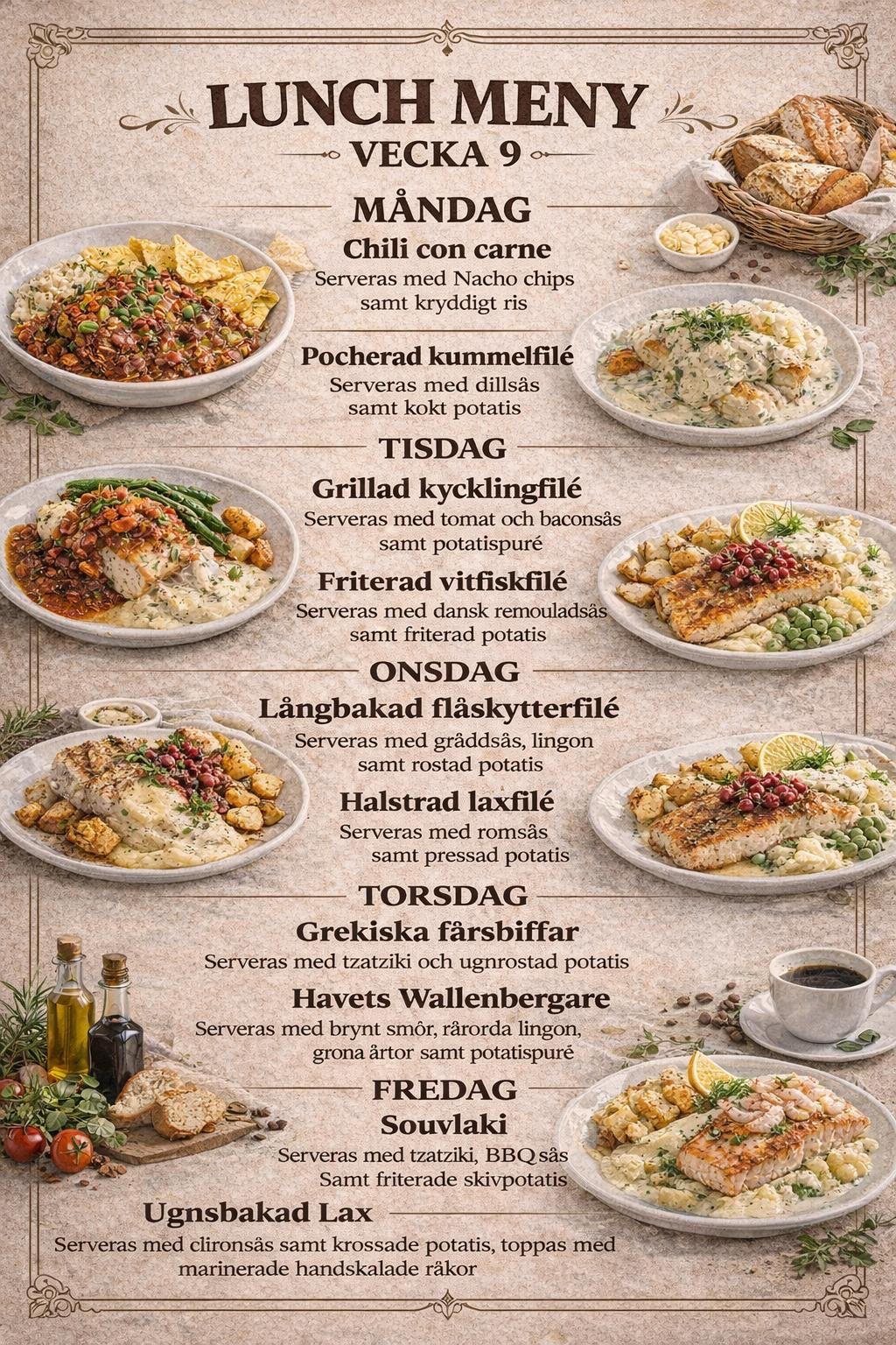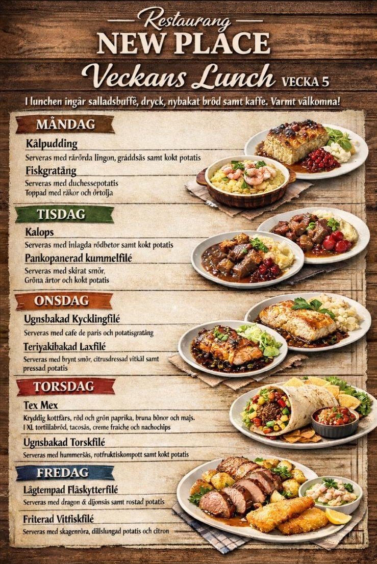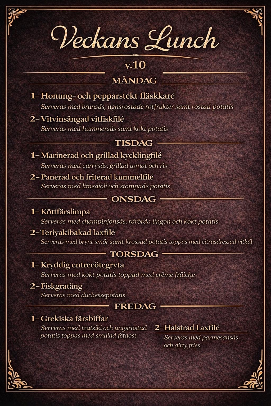 Lunchen serveras måndag till fredag och går även att ta med som take-away. Välkommen och se vad som står på menyn den här veckan!