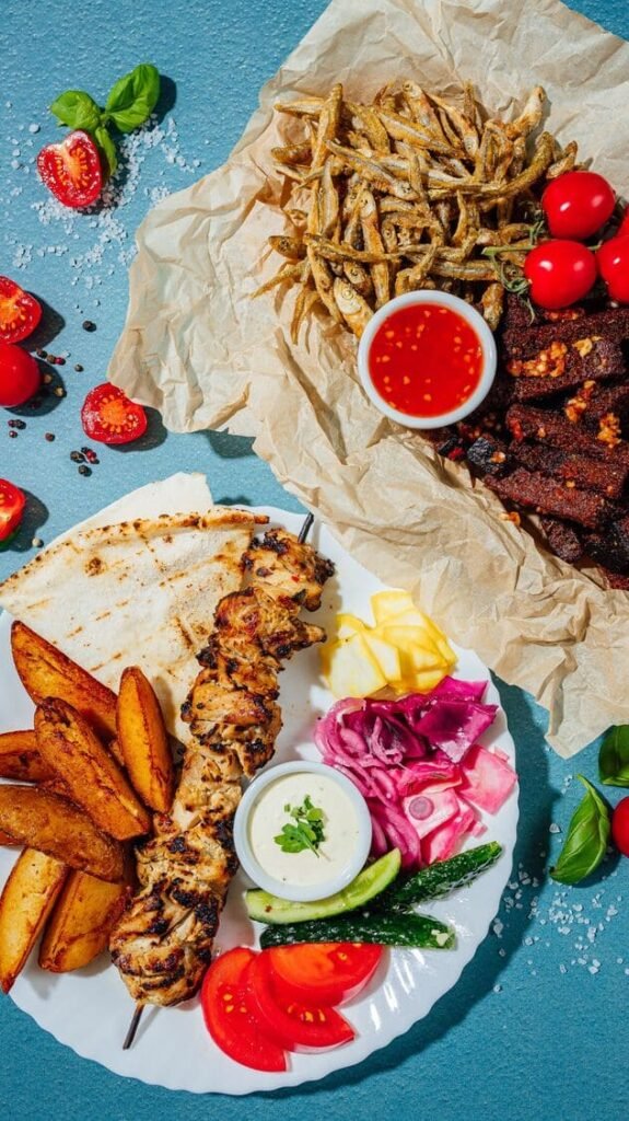 Pork fillet and marinated chicken fillet on seperate skewers with barbeque sauce and tzatziki. Served with fried potato slices.