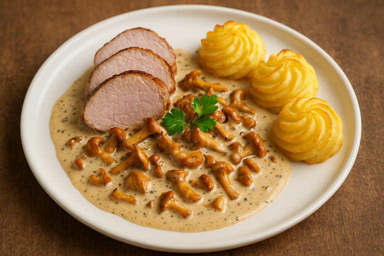 Pork tenderloin with Béarnaise sauce, chanterelle sauce, broccoli and grilled tomato. Served with duchess potatoes.