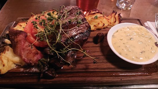 Butter-fried salmon with blue cheese quilt. Served on oak plank with duchess potatoes.